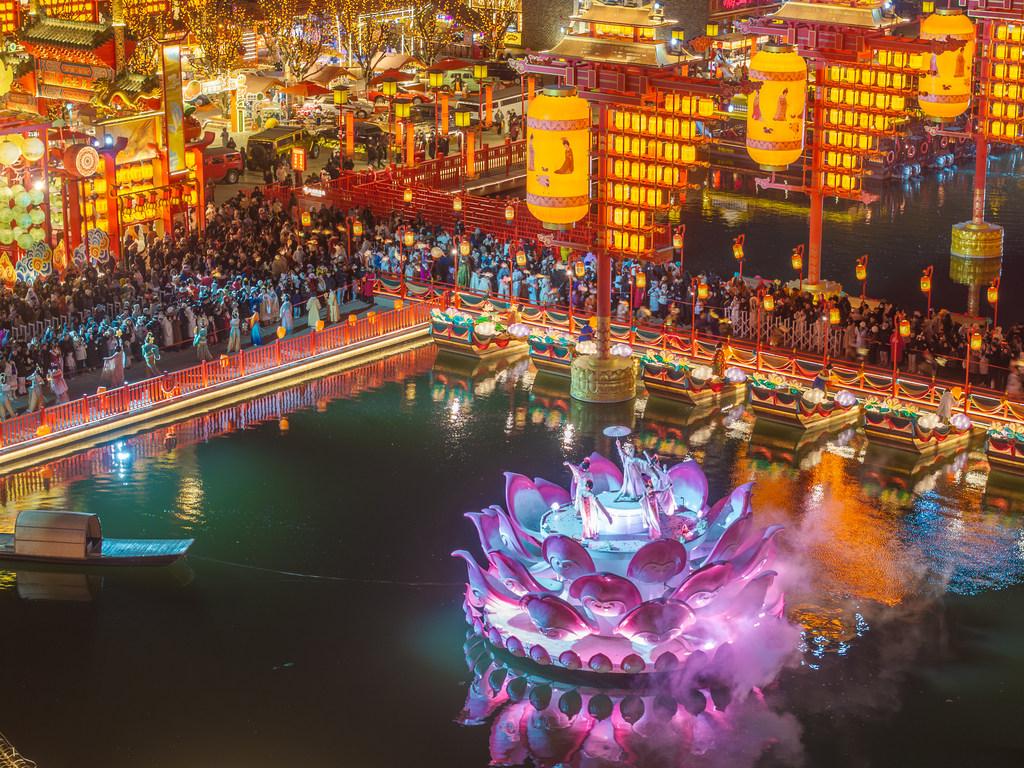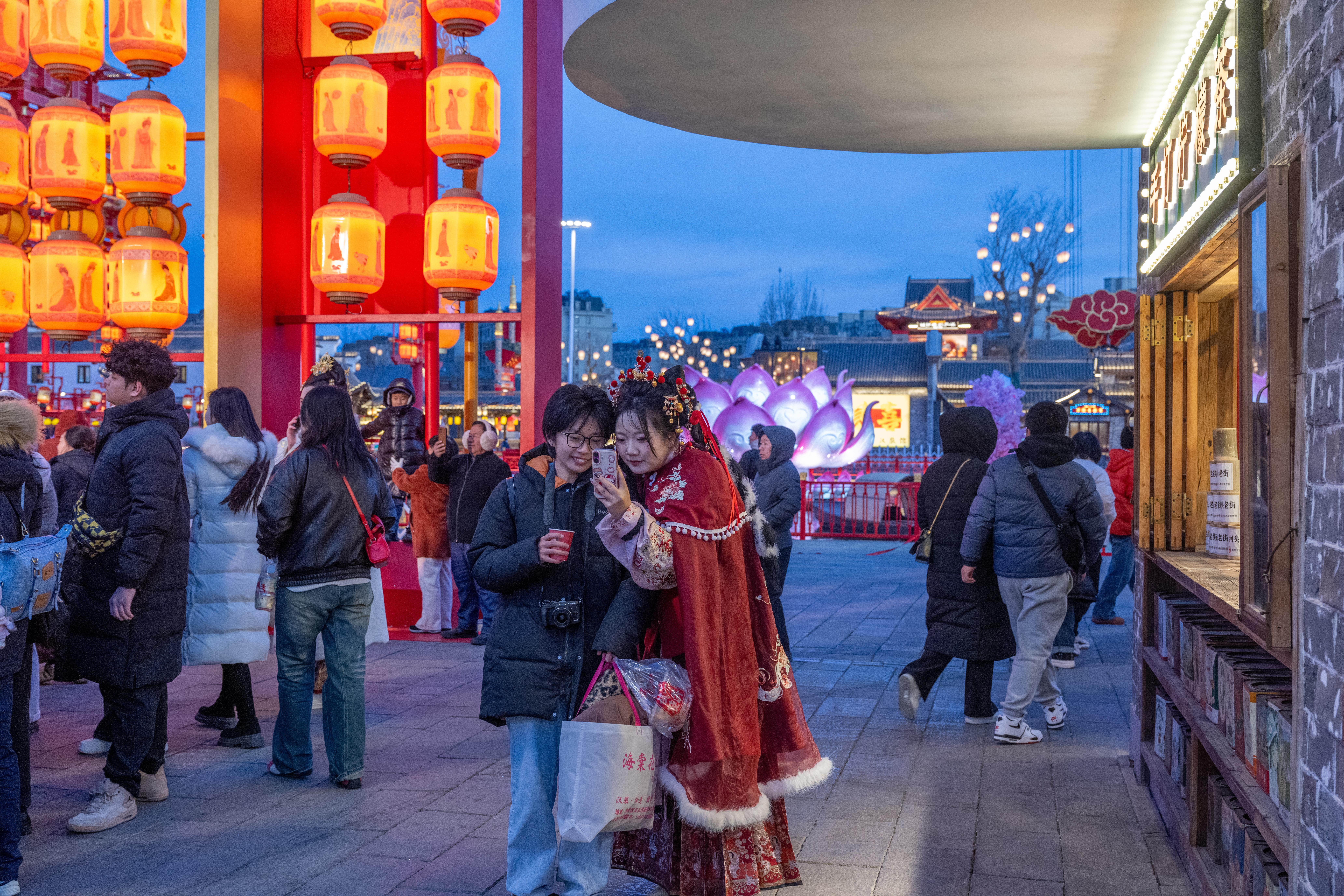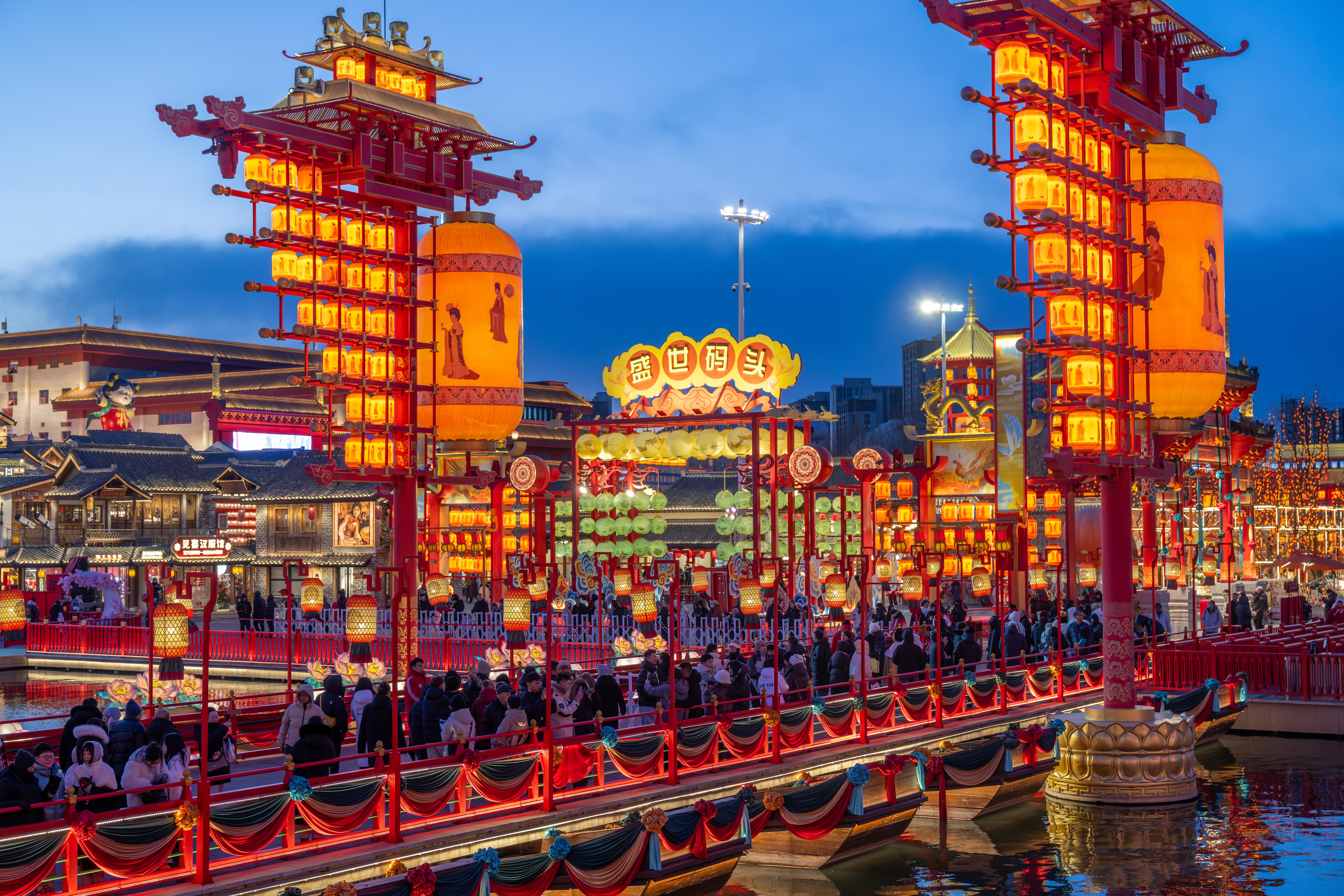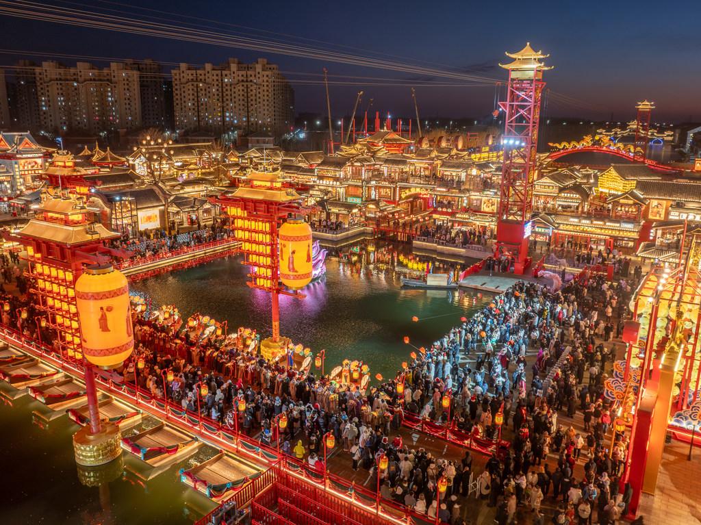 1月10日,唐山市河头老街景区灯火璀璨,游人如织。