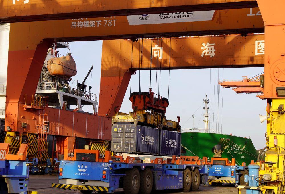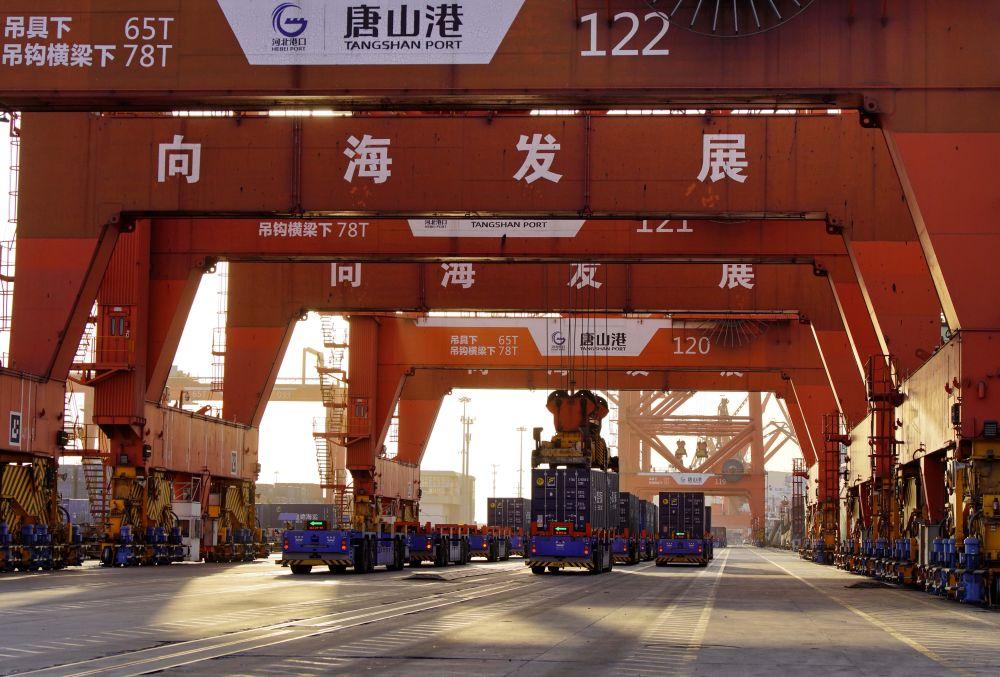 ↑2月5日,唐山港京唐港区的无人运输车在集装箱码头作业。