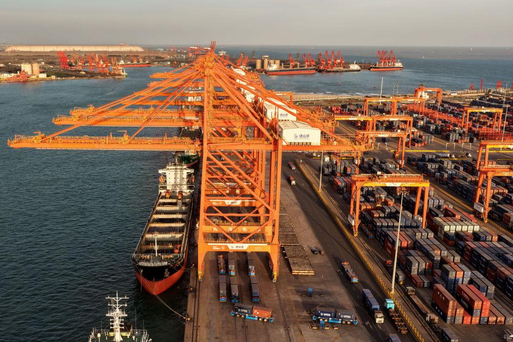 ↑2月5日,轮船靠泊在唐山港京唐港区的集装箱码头装货(无人机照片)。