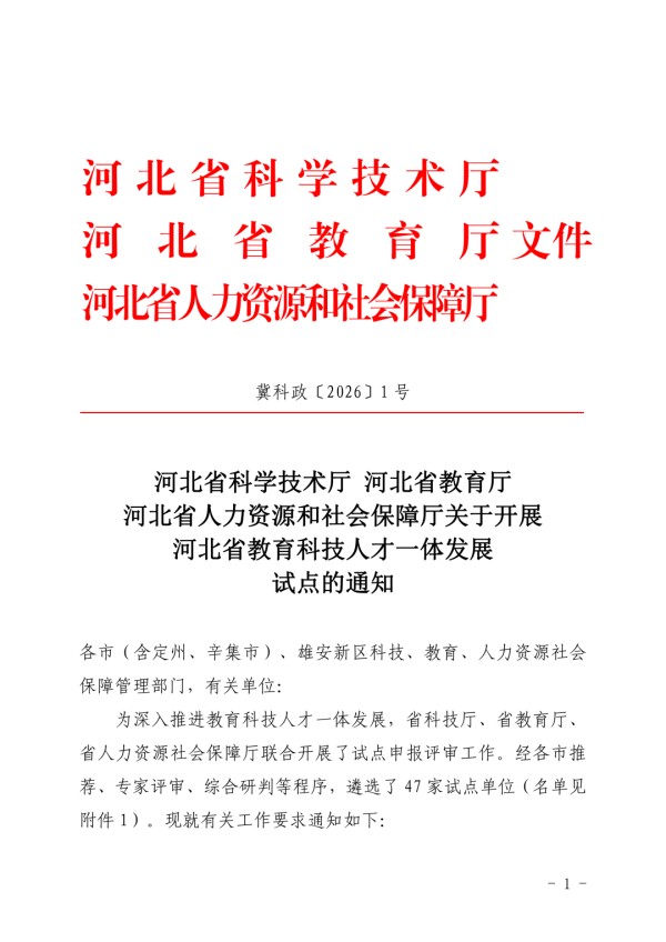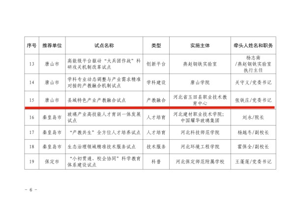近日,河北省科学技术厅、河北省教育厅、河北省人力资源和社会保障厅联合启动教育科技人才一体发展试点申报评审工作,旨在深入推进全省教育、科技、人才领域融合发展,打造产教融合、科教融汇的创新样板。经各市择优推荐、省级专家严格评审、多部门综合研判等环节,最终确定47家单位为试点单位,玉田职教中心凭借突出的办学特色与融合发展成效,成为唯一一所入围试点的中职学校。作为省内职业教育的标杆,玉田职教中心长期深耕“教育筑基、科技赋能、人才支撑”三位一体发展模式,构建了“专业对接产业、课程对接岗位、教学对接生产”的育人体系,学校先后与县域20余家行业龙头企业共建产业学院、实训基地,引入企业真实项目进课堂,推动教学过程与生产过程深度对接;依托校企实训基地、职业教育名师工作室,搭建“双师型”教师培养平台,促进了教师科研能力与教学水平同步提升,为区域产业发展输送了大批高素质技术技能人才。