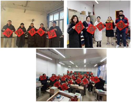 活动现场,红幅铺展,墨香四溢。三位老师挥毫示范,从握笔姿势、运笔技巧到间架结构,耐心细致地讲解福字的书写要领,一笔一划尽显书法艺术的精妙。教职工们热情高涨,纷纷提笔蘸墨,在老师们的悉心指导下认真临摹。落笔之间,或遒劲有力、或舒展飘逸的福字跃然纸上,一张张红彤彤的福字承载着大家对新年的美好期许,现场洋溢着欢乐祥和的节日气息。