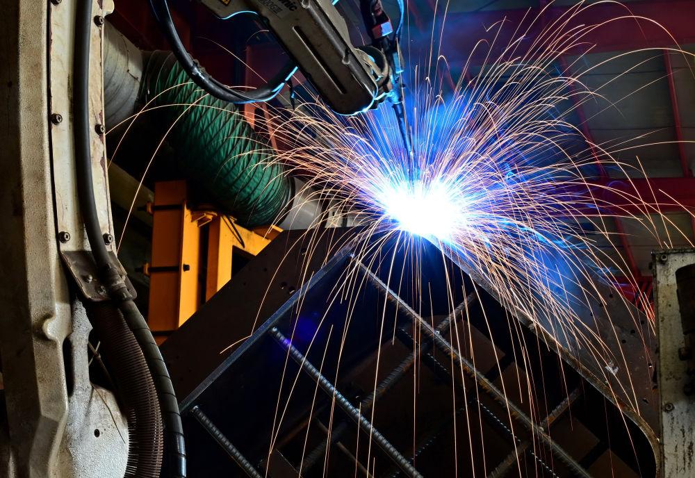 ↑12月28日,河北省唐山市丰南区一家汽车配件企业的智能焊接设备在工作中。