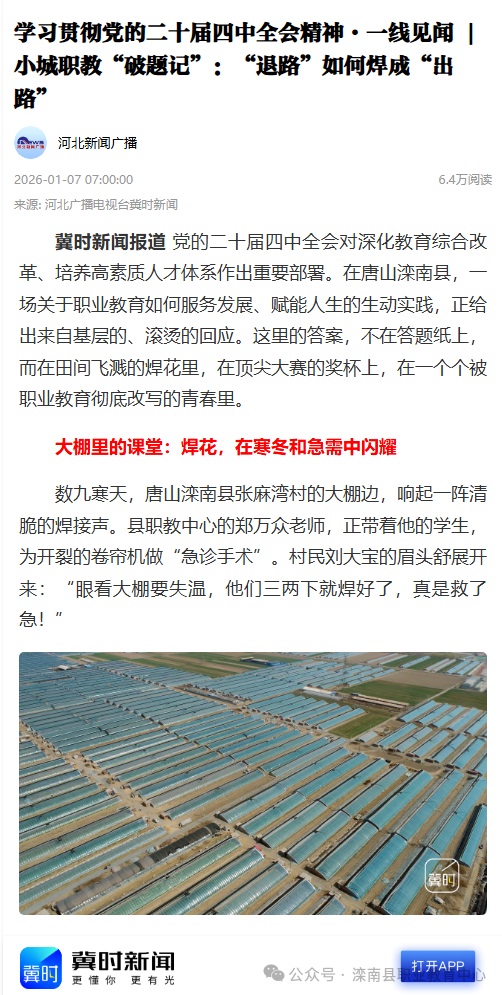河北广播电视台冀时新闻以《学习贯彻党的二十届四中全会精神•一线见闻|小城职教“破题记”:“退路”如何焊成“出路”》,报道滦南县职业教育中心办学成果。