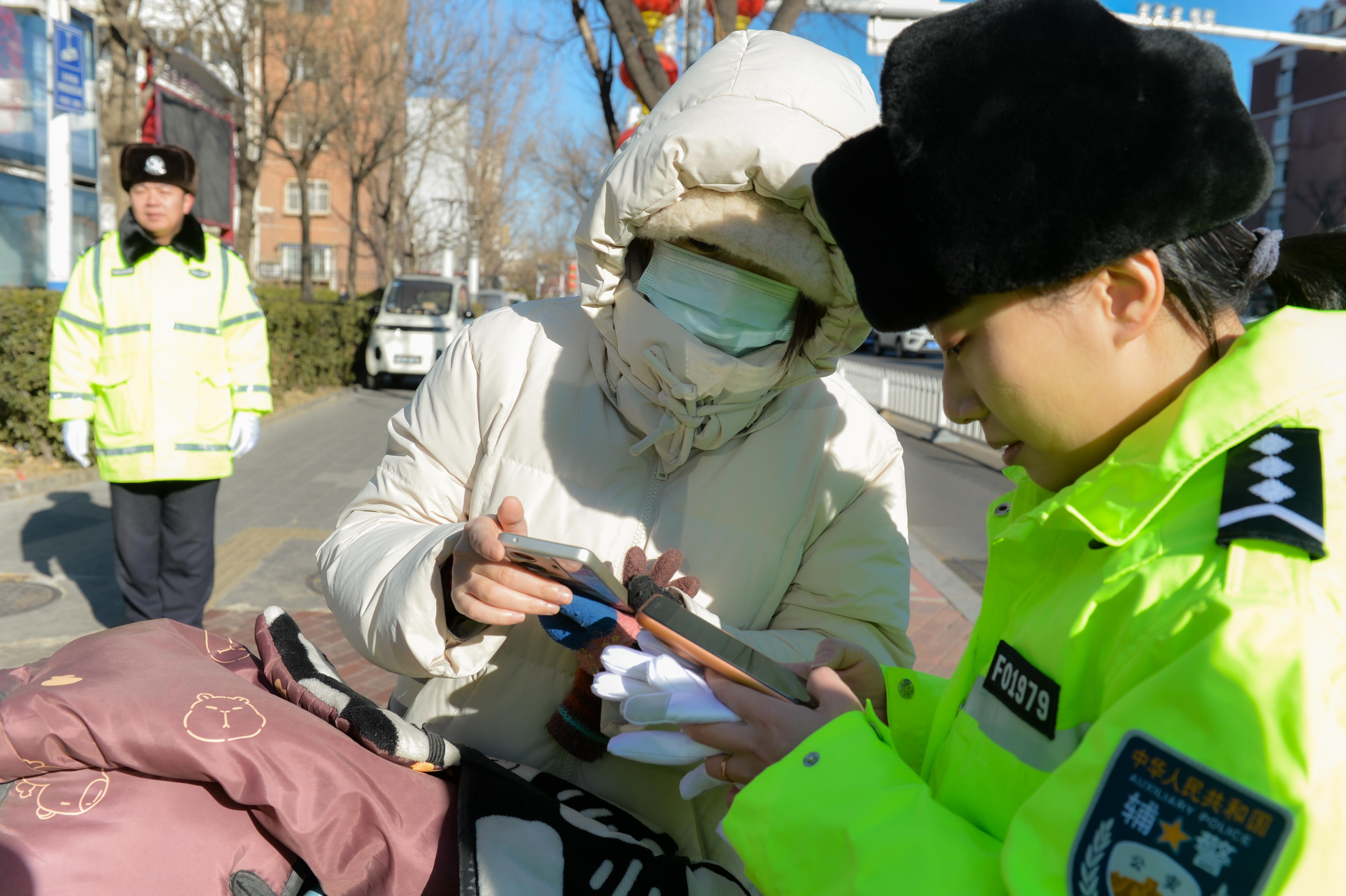 当日上午,在市中心区繁华商圈的北新道与卫国路交口,扩音器在循环播放交警提示,志愿者向路人赠送交通安全宣传贴,其中4位来自快递行业的志愿者尤为引人注目,他们向同行及市民高声倡议“头盔一戴,宇宙最帅”,以接地气的口号传递安全理念。