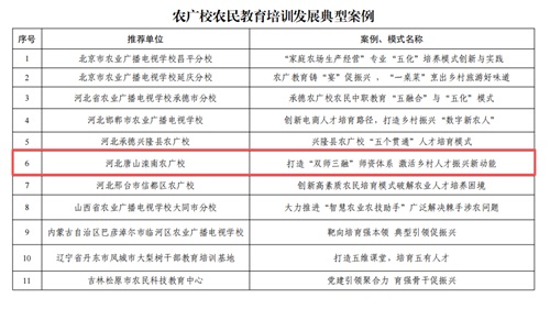 近日,中央农业广播电视学校、中国农民体育协会联合发布《关于公布2025年全国农民教育培训宣介活动结果的通知》,对在推动农民教育和农民体育事业高质量发展中涌现出的先进典型进行宣介。其中,滦南职教中心农广校管理处申报的《打造“双师三融”师资体系 激活乡村人才振兴新动能》案例,成功入选“农广校农民教育培训发展典型案例”,成为全国获评的72个优秀案例之一。