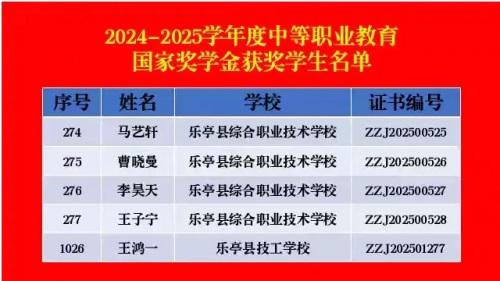 近日,教育部、人力资源社会保障部联合发布2024—2025学年度中等职业教育国家奖学金获奖学生名单。在全国数百万中职学子的激烈角逐中,我校五名学子凭借卓越的学业成绩、精湛的技能水平以及全面的综合素质脱颖而出,荣登榜单!这份沉甸甸的荣誉,不仅是对获奖学生个人奋斗的高度认可,更是对我校育人成果的有力印证。