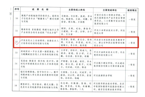 近日,玉田职教中心教学成果《开发农民云上自助课程,助推农业人才培养村村通的创新与实践》获得河北省政府教学成果一等奖,在学校教学成果领域实现了新的突破。该成果以课题《新型职业农民培养教育培训包的研发与应用》为点,记录并升华了学校服务乡村振兴团队将课堂从田间地头延伸至“云端”,跨越“送教下乡、多点帮扶和云上资源”的艰辛历程,建立了“线上学习+线下实操+创业帮扶”的全链条培育体系,打造了“农民云上点餐自助学习”新场景,凝聚了学校在服务乡村振兴征程上的集体智慧和硕果,形成了可复制可推广的职业教育服务乡村振兴新模式。