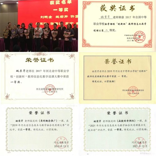 教学中,姚荣芹老师紧密结合专业特点,不断创新教学方法,将抽象的数学知识具象化、枯燥的教学内容生动化,让数学课堂贴近专业、贴近学生,有效提升了课堂吸引力与教学实效。她积极参与各级教学竞赛,荣获全国中等职业学校文化基础课程“创新杯”教师信息化教学说课交流活动一、二等奖、第五届全国职业院校信息技术与教学融合创新课例二等奖、河北省职业院校技能大赛教学能力比赛二等奖、省级优质课一等奖、县微课大赛一等奖,获评市、县优质课指导教师一等奖。她坚持以赛促教、以研促学,悉心指导青年教师,所带徒弟斩获省级优质课二等奖。教研路上步履不停,先后主持2项省级课题、参与4项省级课题,以扎实教研为教学提质赋能。