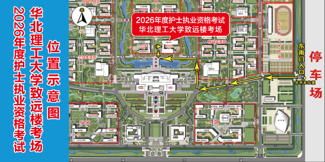 1.华北理工大学致远楼考场的考生应由华北理工大学东南门进校,到致远楼参加考试,具体位置如下图所示。