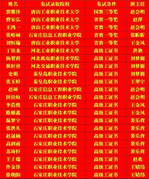全校共有20余名优秀学子,凭借国赛三等奖、省赛一等奖或高级工证书,被唐山工业职业技术大学、河北工业职业技术大学、石家庄职业技术学院、石家庄信息工程职业学院、河北机电职业技术学院等省内知名高职院校免试录取,真正实现了“以技立身、以能升学”,为全校学子树立了技能成才的标杆。
