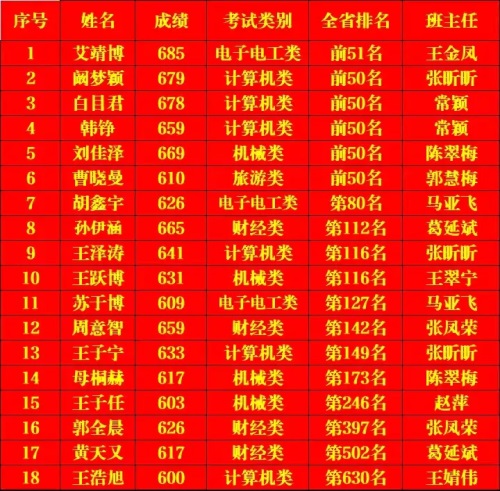 刘佳泽(23汽修升学班)以669分夺得机械类全省前50名;
