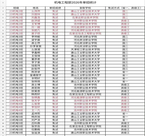 学校坚持“以赛促学、以赛促升”,推动技能竞赛与升学通道深度融合,64名学子凭借国赛、省赛一等奖及高级工证书免试升入高职院校,其中唐山工业职业技术大学录取28人,免试升学规模与质量再创新高。现代服务部10余名学子免试录取至唐山工业职业技术大学、河北建材职业技术学院等优质高校;计算机工程部多名学子凭借世界职业院校技能大赛、省赛一等奖斩获免试资格;机电工程部39名学子凭借技能大赛获奖直接免考升学,真正实现了“技能在手,升学无忧”。