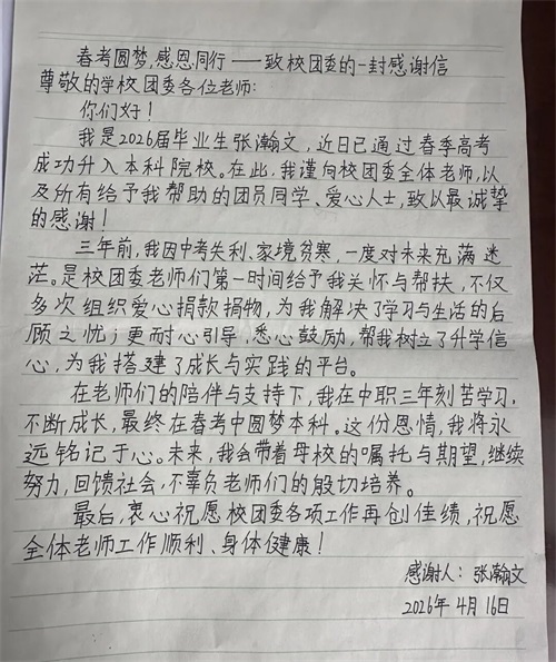 为表达感恩,张瀚文同学特意写下表扬信,深情回顾学校、团委和老师们多年来的悉心关怀与帮助,字里行间满是真挚谢意。他现场发言表示,正是团组织和学校的持续帮扶与鼓励,让他得以安心学习、顺利升学。这笔助学金不仅缓解了入学压力,更给予他前行的动力。他将铭记恩情,努力学习,将来回馈社会。