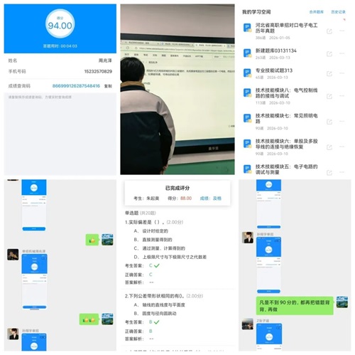 经过四年不懈努力,机电技术系从最早的单招三类上线率远超省录取率,到近两年单招电子电工类、机械类接连实现全员上线、过线率100%。2025年单招考试中,曹建杰同学以730分斩获全省前三;2026年,刘润田同学以715分再创辉煌、续写荣光,同年公办院校上线率达到63.4%。与此同时,崔煜川、王振然、张中奇、李铭辉、李峻锐、赵程旭、刘俊岐等多名同学以全国技能大赛一等奖、二等奖、河北省技能大赛一等奖免试升入大专,李东轩、张浩、李锋等多名学生完成专科学习考入本科院校继续深造。这一成绩的取得,是师生同心、家校协同的结果,更是坚持科学辅导、精准施策的最好见证。