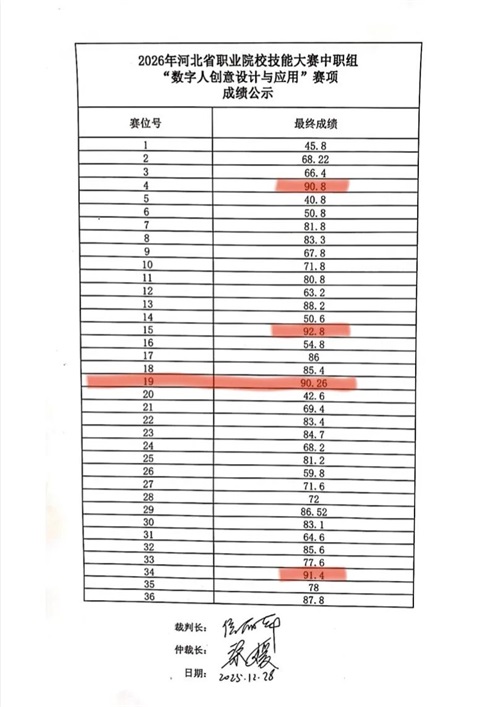 近日,由河北省教育厅主办的2026年河北省职业院校技能大赛(中职组)传来捷报。我校参赛队伍在“数字人创意设计与应用”“数字艺术设计”“短视频制作”三个赛项中表现亮眼,凭借创新的设计理念、扎实的专业技能与默契的团队协作,在全省众多参赛队伍中脱颖而出,一举斩获三个赛项一等奖。
