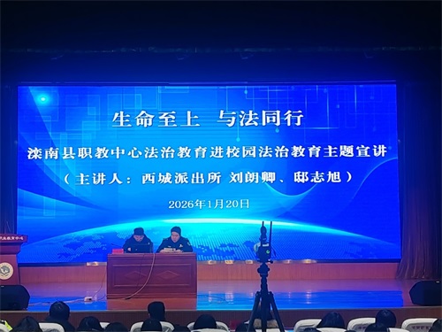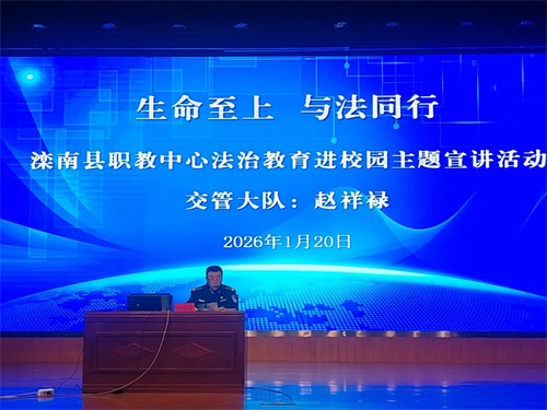为进一步增强青少年法治观念与安全意识,营造平安、文明、和谐的校园环境,1月20日,滦南县职业教育中心举行“生命至上 与法同行”法治教育进校园主题宣讲活动。出席活动的领导有:滦南县公安局交管大队副大队长赵祥禄,警官庞传涛、何光耀,职教中心法治副校长、西城区派出所指导员李学志,西城区派出所警官刘朗卿、邸志旭,滦南县教育局安全卫生指导中心主任王仕强,职教中心副校长张新军以及相关处室负责人。政教处主任李志远主持活动。