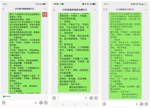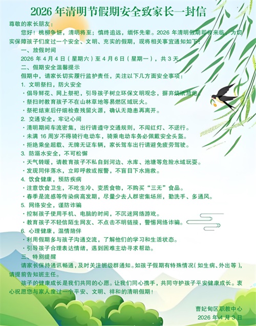 学校发布《2026年第31个全国中小学生安全教育日致家长一封信》及《2026年清明节假期安全致家长一封信》,通过各班微信群发送至家长,明确安全注意事项,呼吁家长履行监护职责,共同守护学生安全。